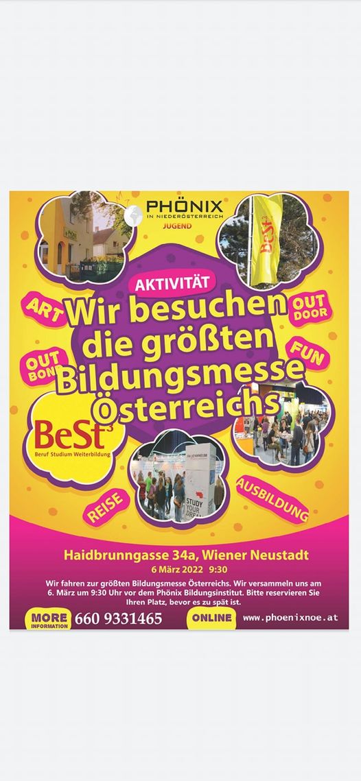 Wir fahren zur größten Bildungsmesse Österreichs. Wir versammeln uns am 6. März um 9:30 Uhr vor dem Phönix Bildungsinstitut. Bitte…