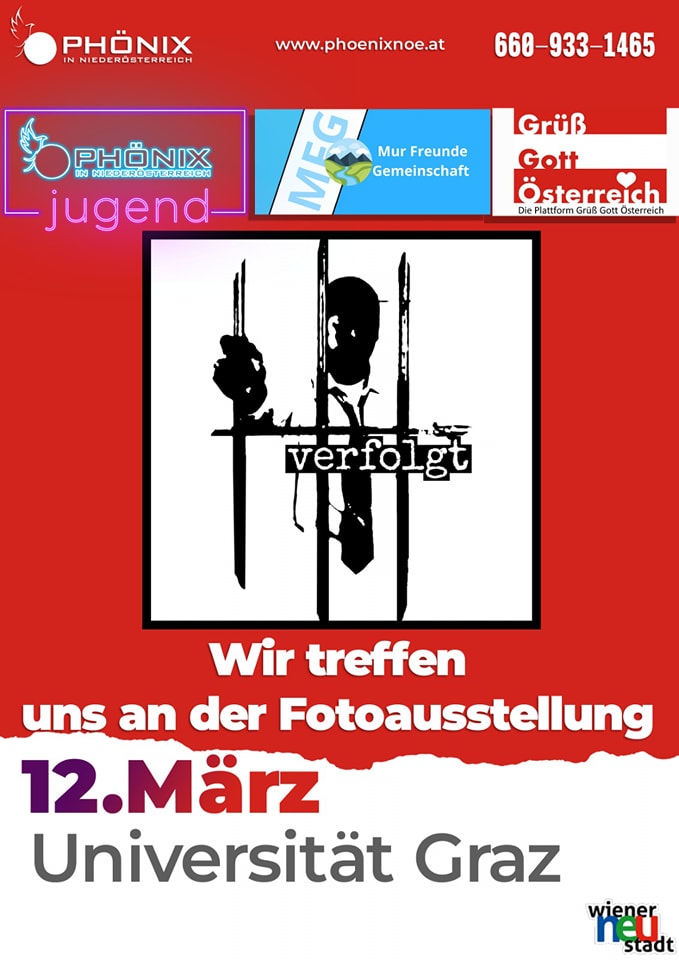 Einladung zur Vernissage „verfolgt“ Hiermit möchten wir, „Mur Freunde Gemeinschaft”, Verein für Dialog, Bildung und Kultur und als „Grüß Gott…